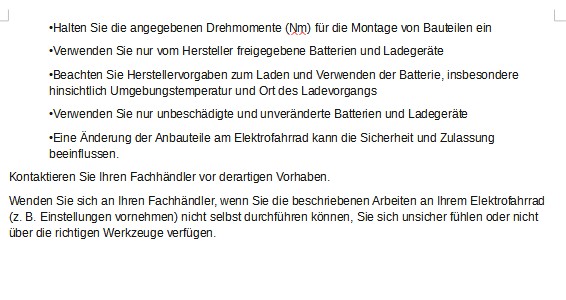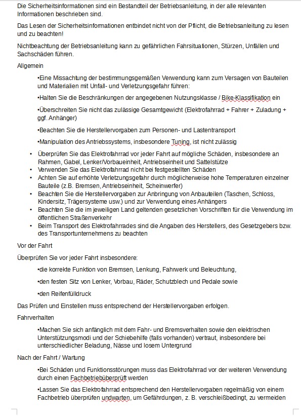 - Eine Änderung der Anbauteile am Elektrofahrrad kann die Sicherheit und Zulassung beeinflussen.