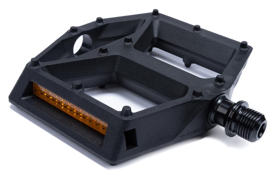 - leichtes Flat-Pedal; Nylon-verstärkter-Kunststoff-Körper und CrMo Achse; angefaste Kanten für erhöhte Bodenfreiheit in Kurven; große Standfläche; flache Bauweise; zwölf Pins pro Seite; LSL-Bushing; integrierte Reflektoren